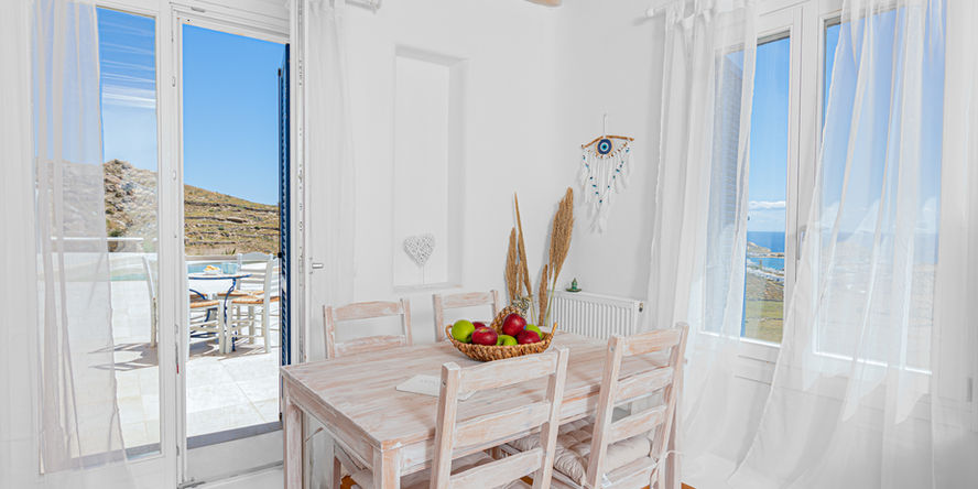 This villa is part of a brand-new family 2-villa complex, located in the south part of the island. The location offers unique tranquility away from any other residential development and unobstructed stunning views towards Divouno and Kalafati Beach and the deep blue waters of the Aegean Sea.